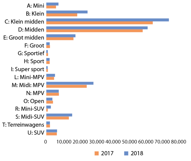Het segment dat het grootste is en in 2018 het meeste groeide is C-Groot. Maar ook van de kleinere bestelwagens nam export toe. Daarbij daalt ook in export het aandeel van kleinere en Aziatische merken, en raakt de markt steeds meer geconcentreerd op de grote, Europese merken. Door een sterke groei werd de VW Transporter het meest geëxporteerde model.