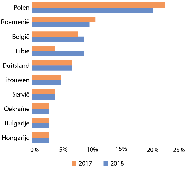 Polen bleef de belangrijkste exportbestemming voor zowel personen- als bedrijfsauto’s. Export naar de tevens belangrijke markt Roemenië daalde. Het aantal bedrijfsauto’s dat naar Libië ging verdubbelde, personenauto’s verdrievoudigden zelfs. Hiermee lijkt de plotselinge piek uit 2012 zich te herhalen. En daarmee neemt het aandeel van Afrika toe. Het aandeel van West-Europese landen stijgt ook langzamerhand naar een kwart van alle exporten.